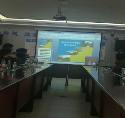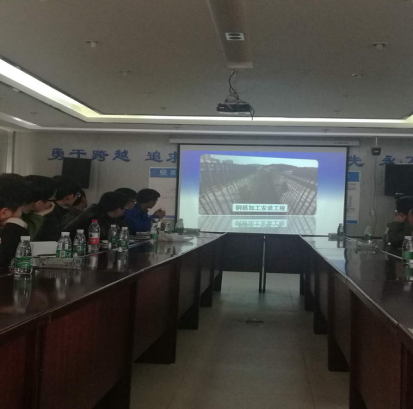 现场听取介绍昌九快速路工程概况以及目前的施工技术特点、难点及进展情况;现场观看了从泡沫混泥土施工工艺、大型桥梁的梁片、张拉、运输、架梁等方面的效果视频及深入细致的讲解,工程的体量和技术难度让人震撼。大家在认真观看视频后,不时地提出问题请教,项目总监都一一进行了解答。