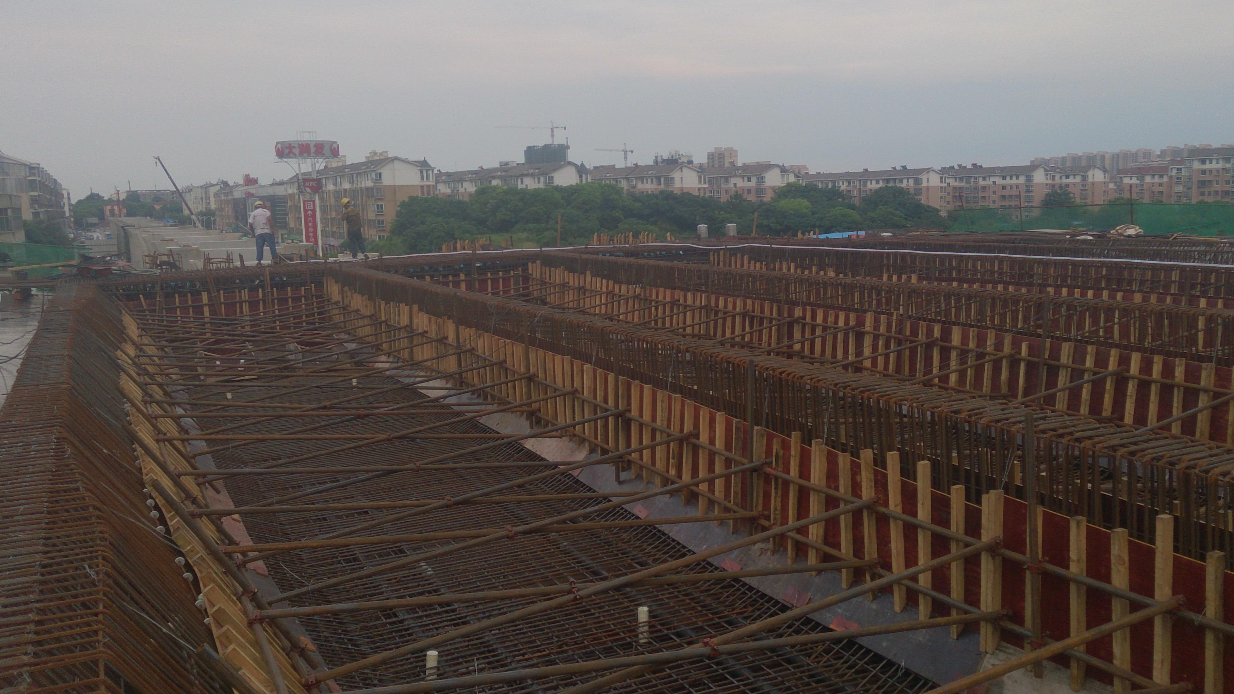 2015年7月22日9点58分南外环高速公路首件跨径30米、宽33.5米的大型预应力砼现浇箱梁在城南路298-299号墩成功浇筑。